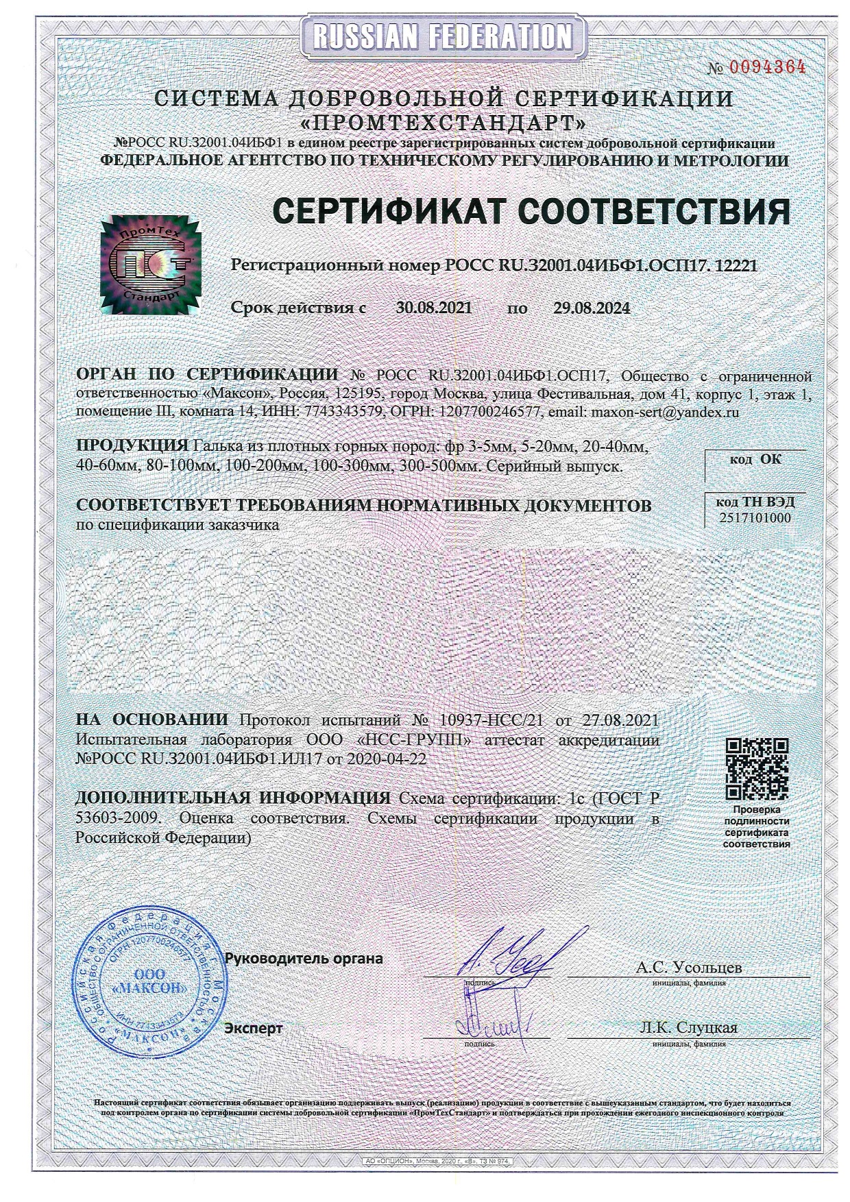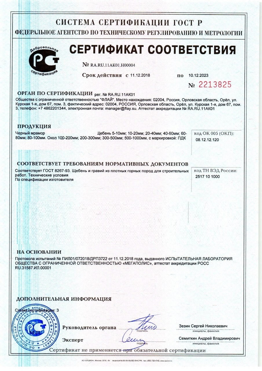 Сертификат соответствия – документ, подтверждающий соответствие продукции требованиям качества и безопасности, установленными для нее действующими стандартами и правилами. Наш камень, который Вы сможете заказать с доставкой в Мытищах , обладает всеми необходимыми документами для реализации и при необходимости могут быть предоставлены все необходимые подтверждающие документы при поставке.